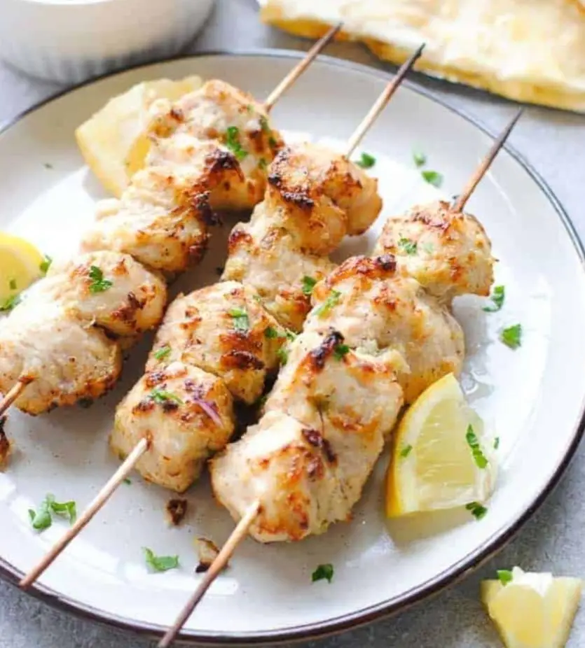 “Juicy Chicken Malai Tikka served on skewers with lemon wedges and green chutney
